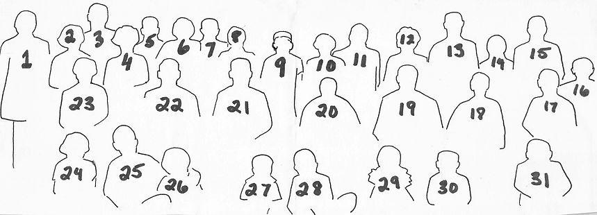 The numbers in the family tree below, and the silhouettes above, provide a key to the photo.